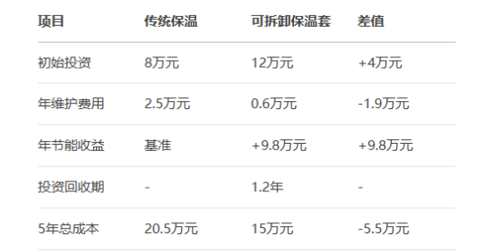 數(shù)據(jù)表明,雖然初始投資高50%,但可拆卸方案可在14個(gè)月內(nèi)通過(guò)節(jié)能收益收回差價(jià)。